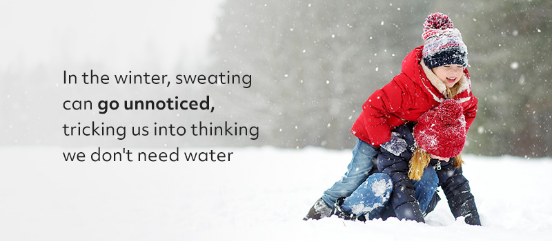 In the winter, sweating can go unnoticed, tricking us into thinking we don't need water. Even when we're not sweating, we lose water through our skin, urination, and other processes. To stay on top of hydration, drink plenty of water in the winter — especially after outdoor physical activities. While cold temperatures might make us less perceptive to it, we are constantly losing water.