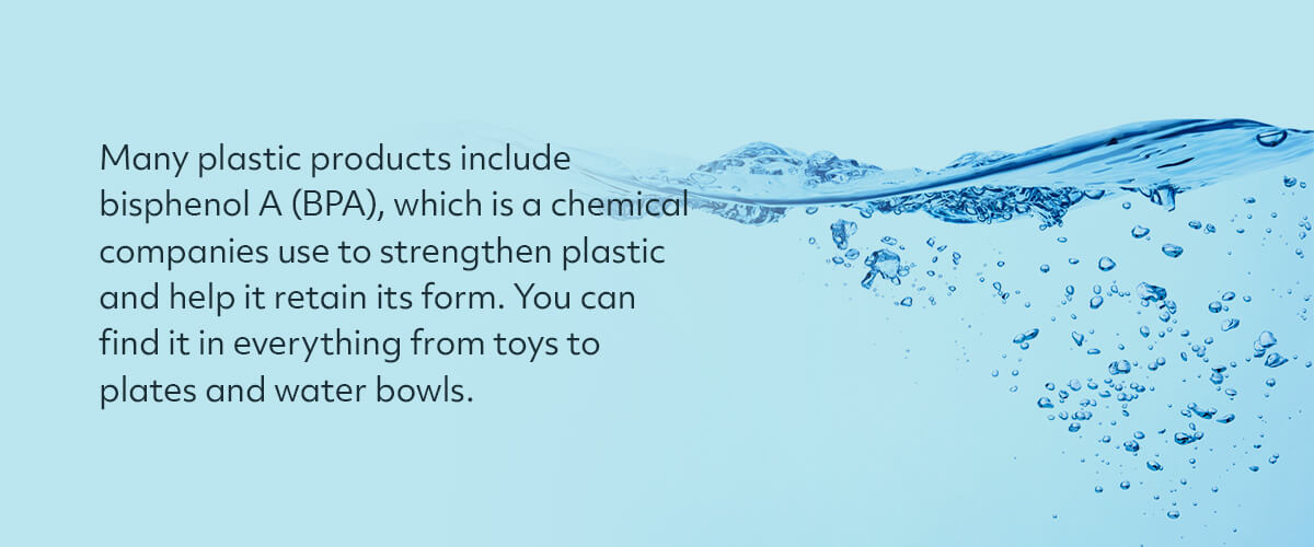 Many plastic products include bisphenol A (BPA), which is a chemical companies use to strengthen plastic and help it retain its form. You can find it in everything from toys to plates and water bowls. Many reusable water bottles and other eating tools market that their products are BPA-free because of the adverse effects of the chemical on the body.
