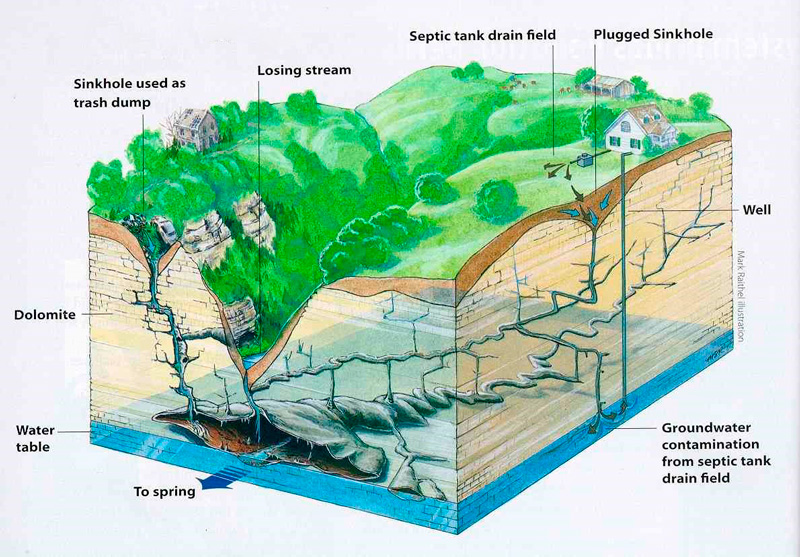 Trash and waste from people’s homes are also man-made contributors to water contamination. Garbage ends up in landfills, where the degradation and decay of the garbage seeps into the ground, enabling harmful contaminants to reach groundwater supplies. Fecal waste and both over-the-counter and prescription drugs flushed down the toilet end up in cesspits or directly to the sewer system. Overflows or leakage from either destination can seep into the ground, where potential contaminants eventually end up in the groundwater.