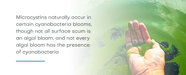 Excess cyanobacteria growing in lakes or ponds will collect in blooms, which look like a film or scum on the water's surface. Microcystins naturally occur in certain cyanobacteria blooms, though not all surface scum is an algal bloom, and not every algal bloom has the presence of cyanobacteria. As such, understanding cyanobacterial growth is important to comprehend what causes microcystins.