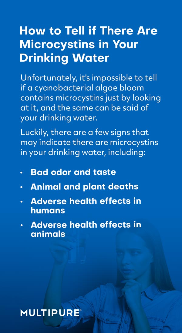 Unfortunately, it's impossible to tell if a cyanobacterial algae bloom contains microcystins just by looking at it, and the same can be said of your drinking water. Luckily, there are a few signs that may indicate there are microcystins in your drinking water, including:
