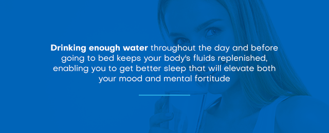 In addition to boosting your mood, staying hydrated can make your mind sharper. Because water deprivation affects sleep quality by disrupting the overall sleep-wake cycle, it is good to drink water before bed to ensure proper mood regulation and mental functioning. Drinking enough water throughout the day and before going to bed keeps your body's fluids replenished, enabling you to get better sleep that will elevate both your mood and mental fortitude.