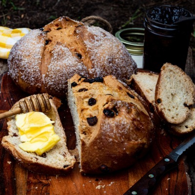 Fold in raisins or currants if desired. Shape the dough into a round loaf and place it on a baking sheet. Cut a large “X” across the top of the loaf. Bake for 30–35 minutes until golden brown. Serve warm with butter for a simple, traditional Irish favorite.