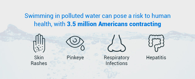 Water pollution is hazardous to human health. Each year, waterborne pathogens cause an estimated 6,630 deaths and 7.15 million illnesses. Even swimming in polluted water can pose a risk, leading to skin rashes, respiratory infections, and hepatitis from coastal waters that contain sewage. Of those affected by water pollution, low-income communities are disproportionately affected, mostly because of their proximity to pollution sources and underfunded infrastructure.